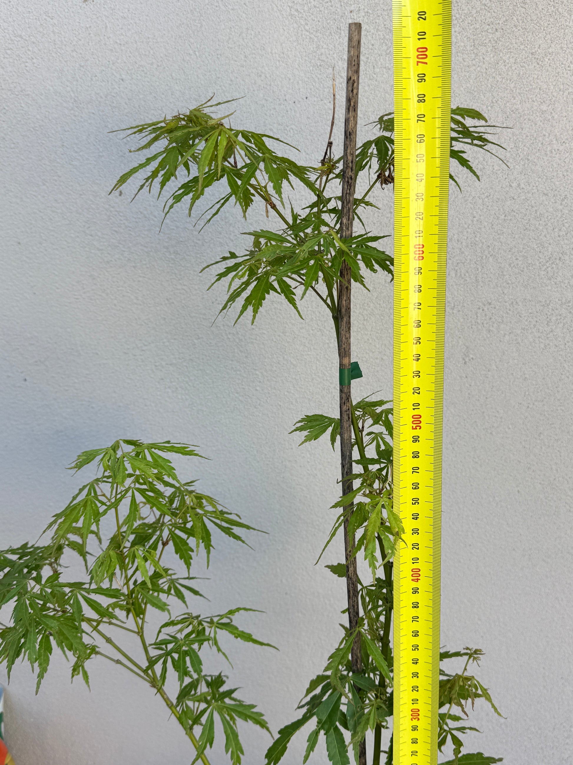 JP21 stands at approximately 700mm high, with an upright, lightly branched form that will develop with time. The long, finely serrated leaves display a dynamic mix of yellow-green, orange, and red tones as the season changes. Some leaf edges show signs of seasonal crisping, typical for deciduous trees heading into dormancy. This compact maple offers elegant structure and vivid autumn colour, perfect for pots, courtyards, or small feature plantings.