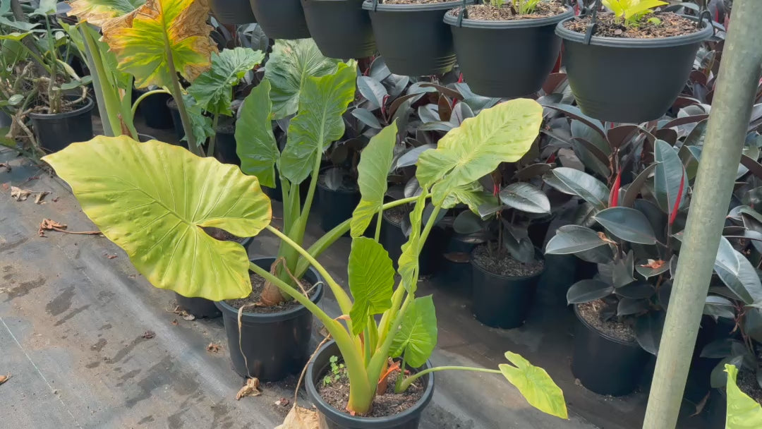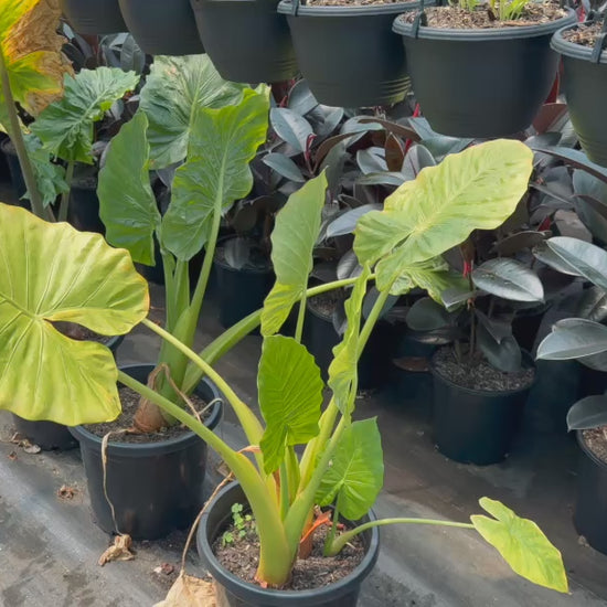 Thriving in warm, humid environments, Giant Taro prefers rich, well-drained soil and benefits from regular watering to maintain its lush appearance. It performs best in partial shade but can tolerate full sun with sufficient moisture. This low-maintenance plant is excellent for large gardens, water feature edges, or as a container plant in cooler climates where it can be overwintered indoors.