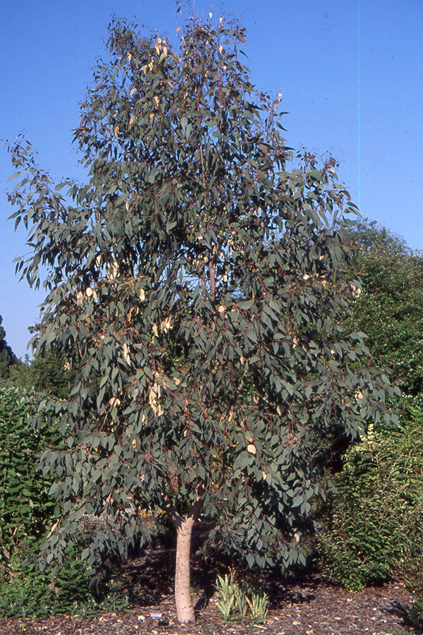 Eucalyptus Blakelyi (Blakely's Red Gum) is a stunning Australian native tree known for its smooth, mottled bark and clusters of creamy-white flowers. Its slender leaves and reddish-brown seed capsules add year-round interest, making it a versatile choice for large gardens, windbreaks, or revegetation projects.