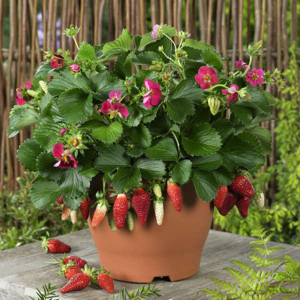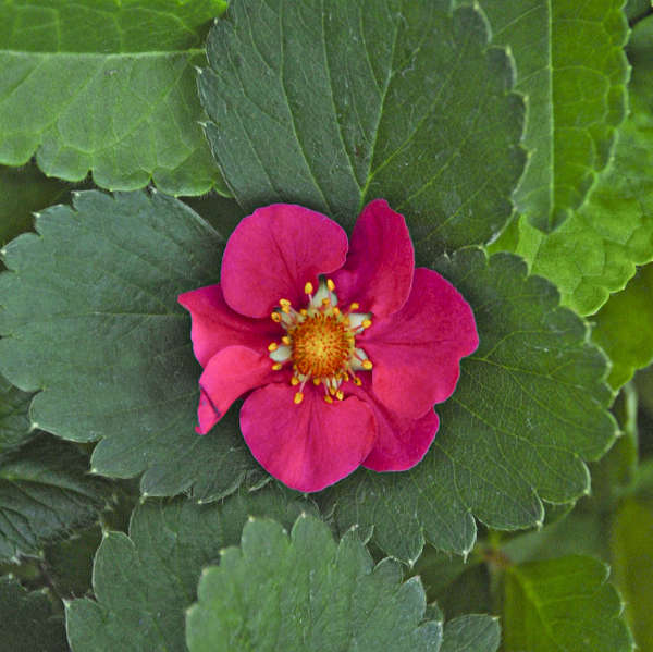 Fragaria x ananassa (Strawberry - Tristan) is a compact, everbearing strawberry perfect for both ornamental and edible gardens. Hot magenta pink blossoms crown dark green foliage while producing small, bright red, aromatic, and sugary sweet fruits all summer