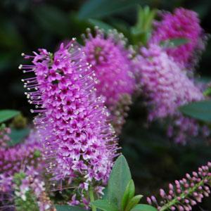 Hebe hybrid (Hebe Sunset Boulevard) is a striking evergreen shrub with a compact, mounded habit and bright green foliage. From summer through autumn, it produces masses of large purple-pink flower spikes that are both eye-catching and fragrant, making it a standout addition to any garden border or container.