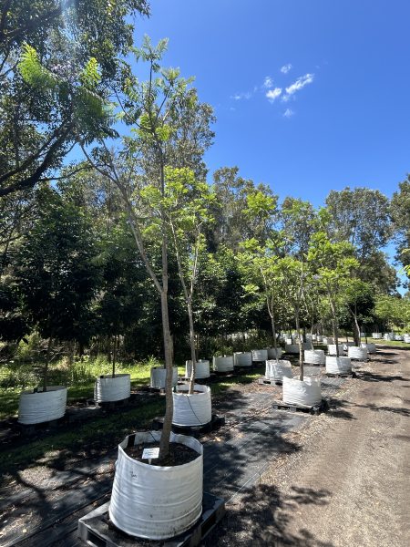 Jacaranda Mimosifolia, commonly known as Jacaranda, is a stunning deciduous tree renowned for its breathtaking display of lavender-blue, trumpet-shaped flowers. Blooming in late spring to early summer, the flowers create a spectacular carpet of colour as they fall, making it a favourite in parks, gardens, and streetscapes. Its fern-like green foliage adds a delicate, airy texture to the tree's elegant form.