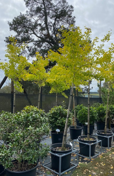 Ginkgo Biloba (Maidenhair Tree) is a unique and ancient deciduous tree admired for its fan-shaped foliage and stunning golden-yellow autumn colour. Its upright, symmetrical form makes it a standout feature in formal landscapes, avenues, and wide garden borders, where it adds strong vertical structure and seasonal contrast. Slow-growing and long-lived, it offers a timeless presence in any setting.