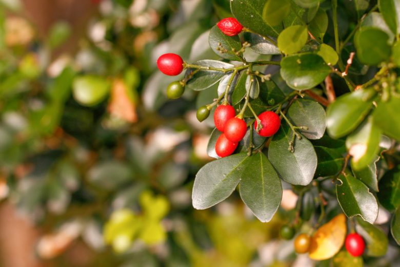 Glossy dark green foliage, fragrant white bell-shaped flowers, bright red ovoid fruits