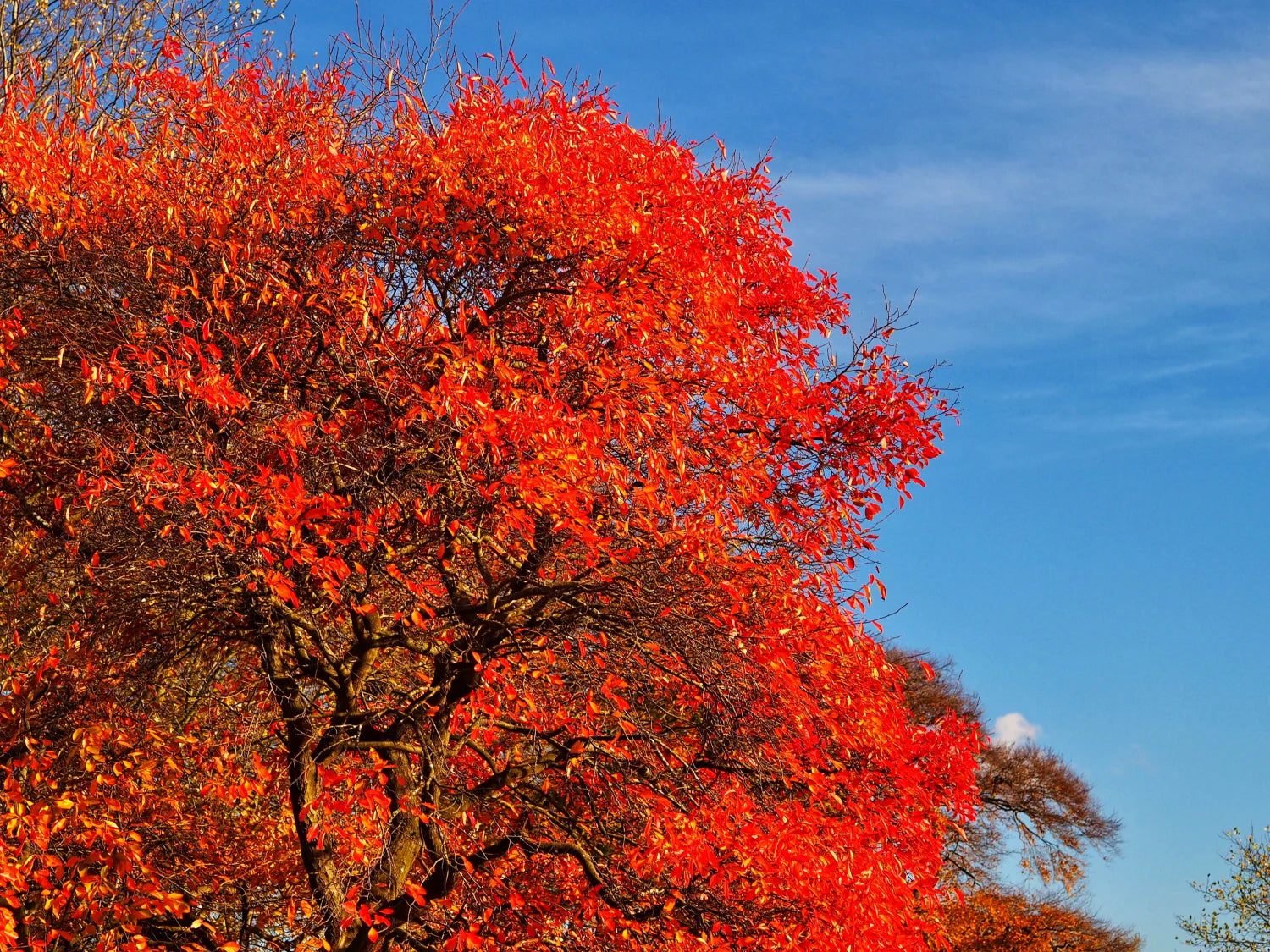 Glossy green foliage turning scarlet, orange and purple in autumn; dark blue fruits