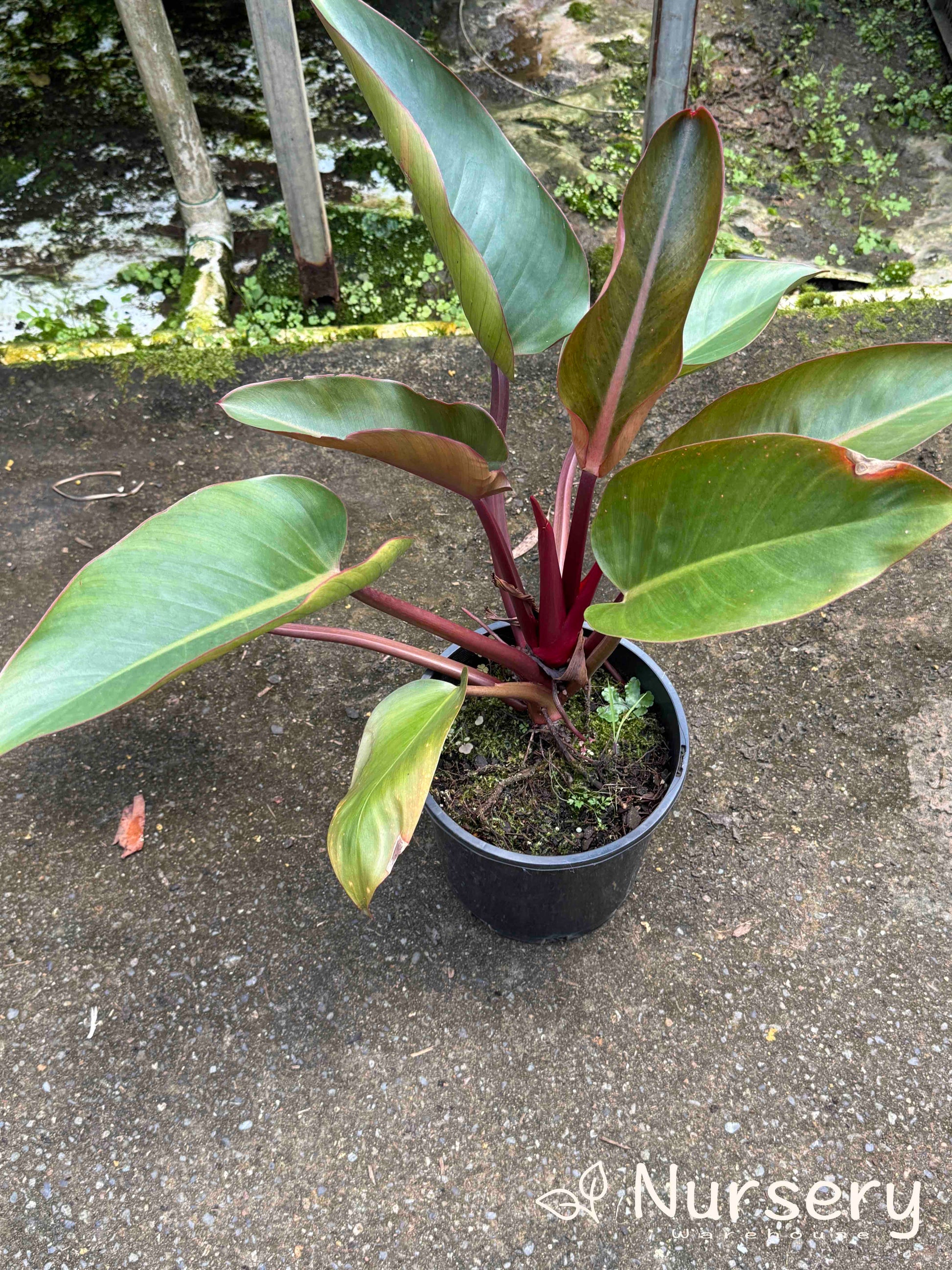These are end-of-batch plants with some variation in shape and size. A few have minor leaf marks or colour inconsistencies but remain healthy and actively growing. Their striking red stems and broad green leaves still make them excellent indoor statement plants once established.